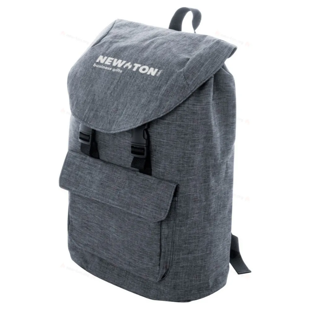 Рюкзак из RPET с застежкой на пряжке и шнурком, передним карманом на липучке, отделением для ноутбука (15"), подкладкой на спине и плечевыми ремнями. Изготовлен из 300D RPET полиэстера с характерной этикеткой RPET.