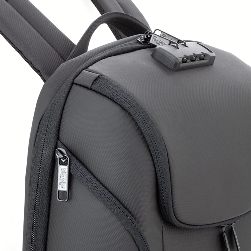 Полужесткий рюкзак с противоугонным карманом на спинке (размер 31x16 см). Имеет USB-вход на одной из сторон для подключения портативного аккумулятора изнутри, что позволяет заряжать мобильный телефон или другие устройства, пока мы используем их снаружи. Внутри имеется мягкая подкладка для ноутбука. На спинке рюкзака предусмотрено эластичное крепление для перевозки на тележке. Открытие на 180º и защитная застежка.