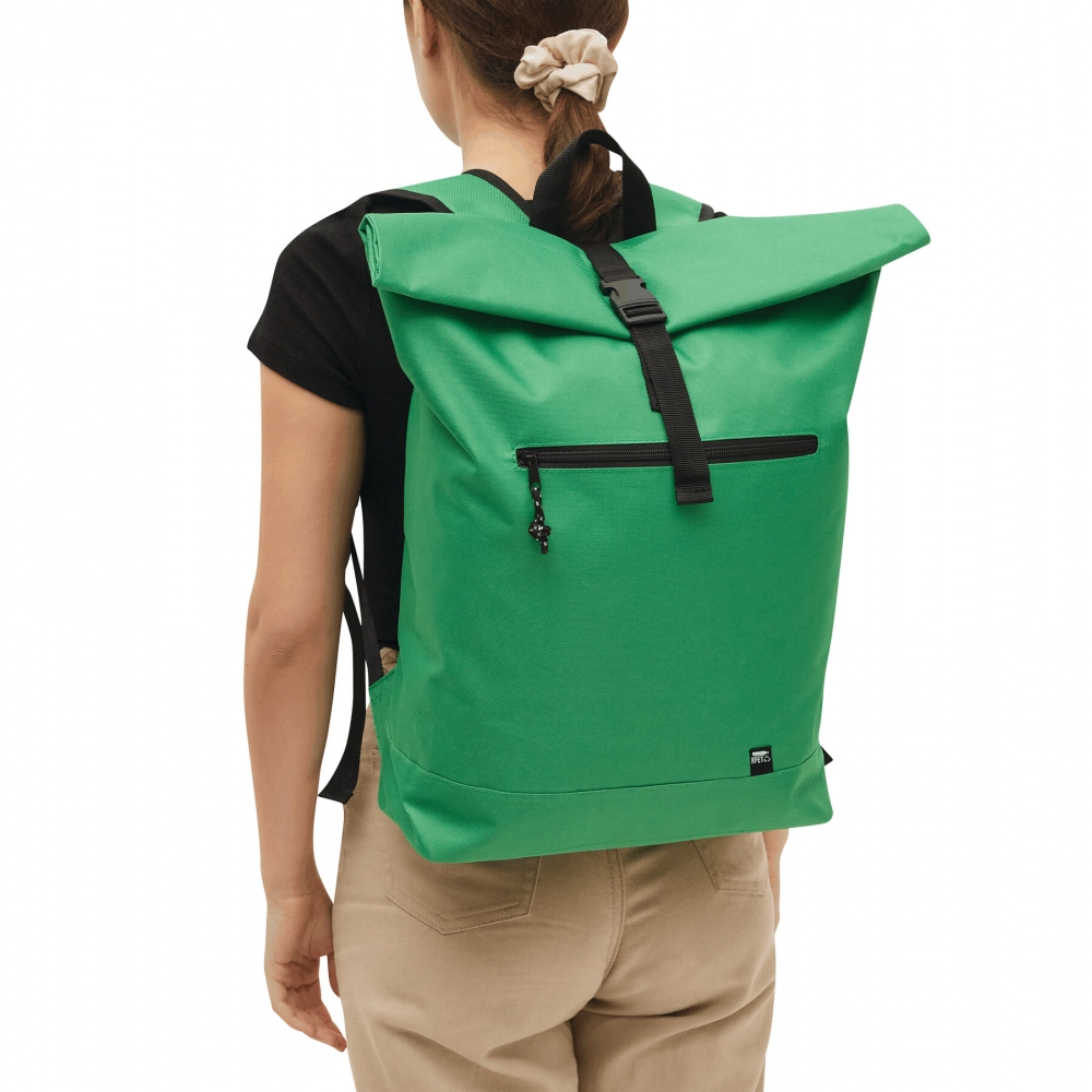 Рюкзак ROLL-TOP: изготовлен из переработанного пластика (RPET), передний отсек на молнии, большое основное отделение с мягким внутренним отсеком для ноутбука или планшета, верх можно свернуть и закрепить застежкой, ручка для переноски, мягкое дно, плечевые ремни, задняя панель
