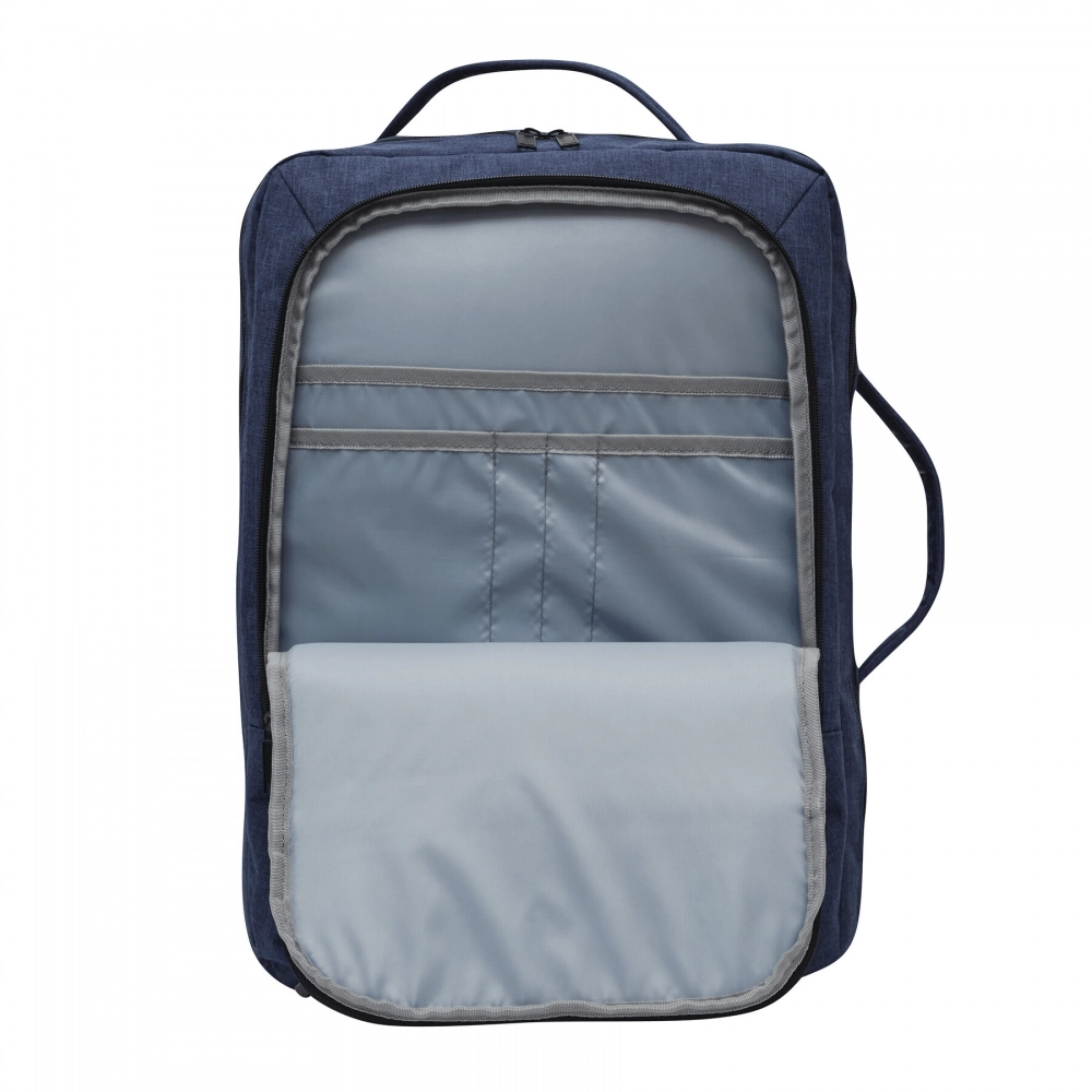 Рюкзак STEWARD: 2 передних отделения на молнии, одно с органайзером (3 кармана, 2 петли для ручек), 1 большое основное отделение с мягкой подкладкой, ремнем для упаковки и молнией, 1 мягкое отделение для ноутбука с молнией, 1 усиленная верхняя и боковая ручка, мягкие эргономичные плечевые ремни и мягкая задняя панель с рукавом для чемодана, 2 компрессионные ремни с застежками на каждой стороне