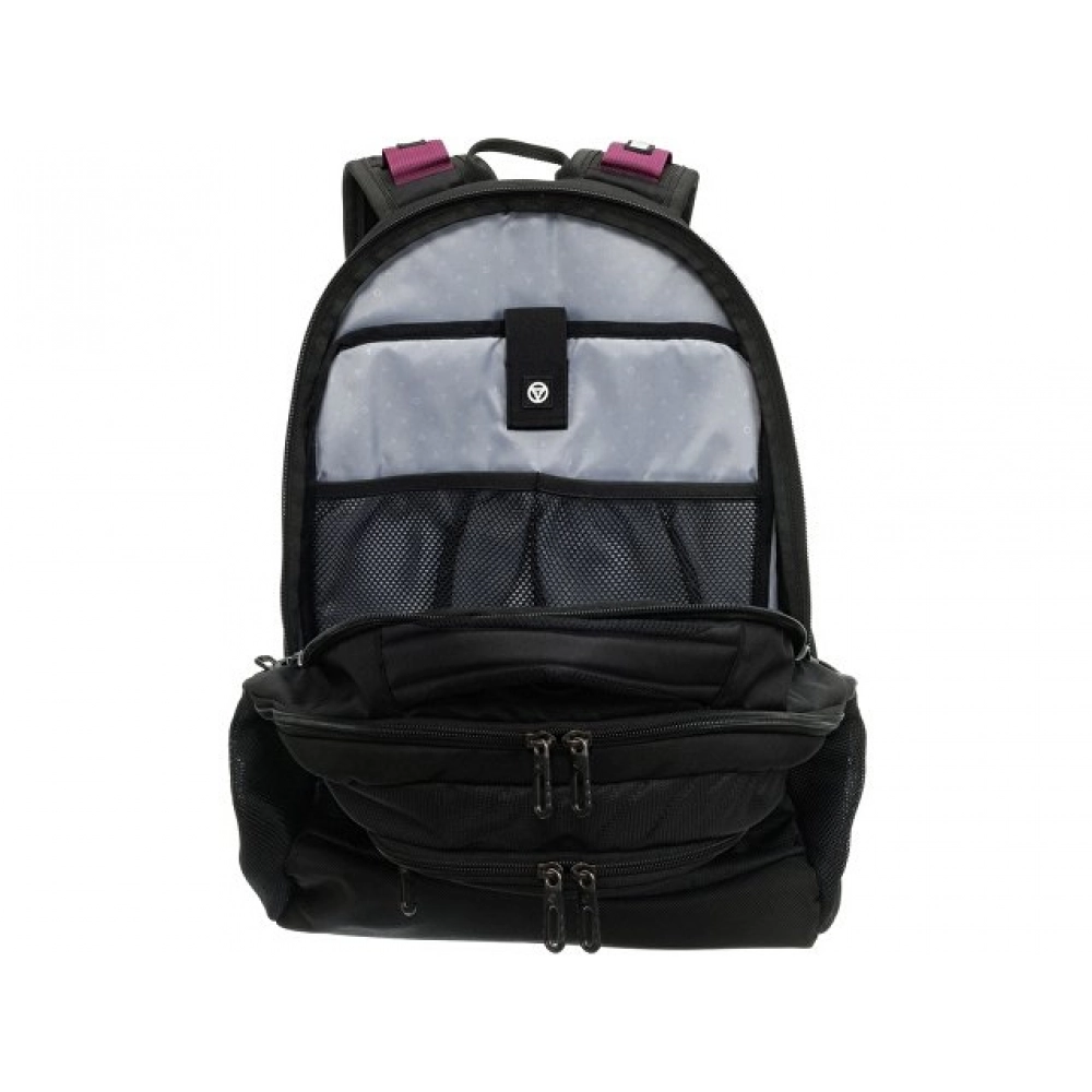 Рюкзак оборудован специальным отделением для ноутбука с диагональю экрана 15". По бокам рюкзака расположены два сетчатых кармана для бутылок с водой или зонта. Рюкзак имеет специальное отделение для телефона или зарядного устройства с отверстием для наушников/проводов.