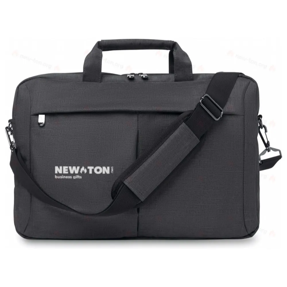 Сумка для ноутбука из полиэстера со съемным ремнем для крепления на чемодане. Имеет наружный карман на молнии, а также отделения для письменных принадлежностей.