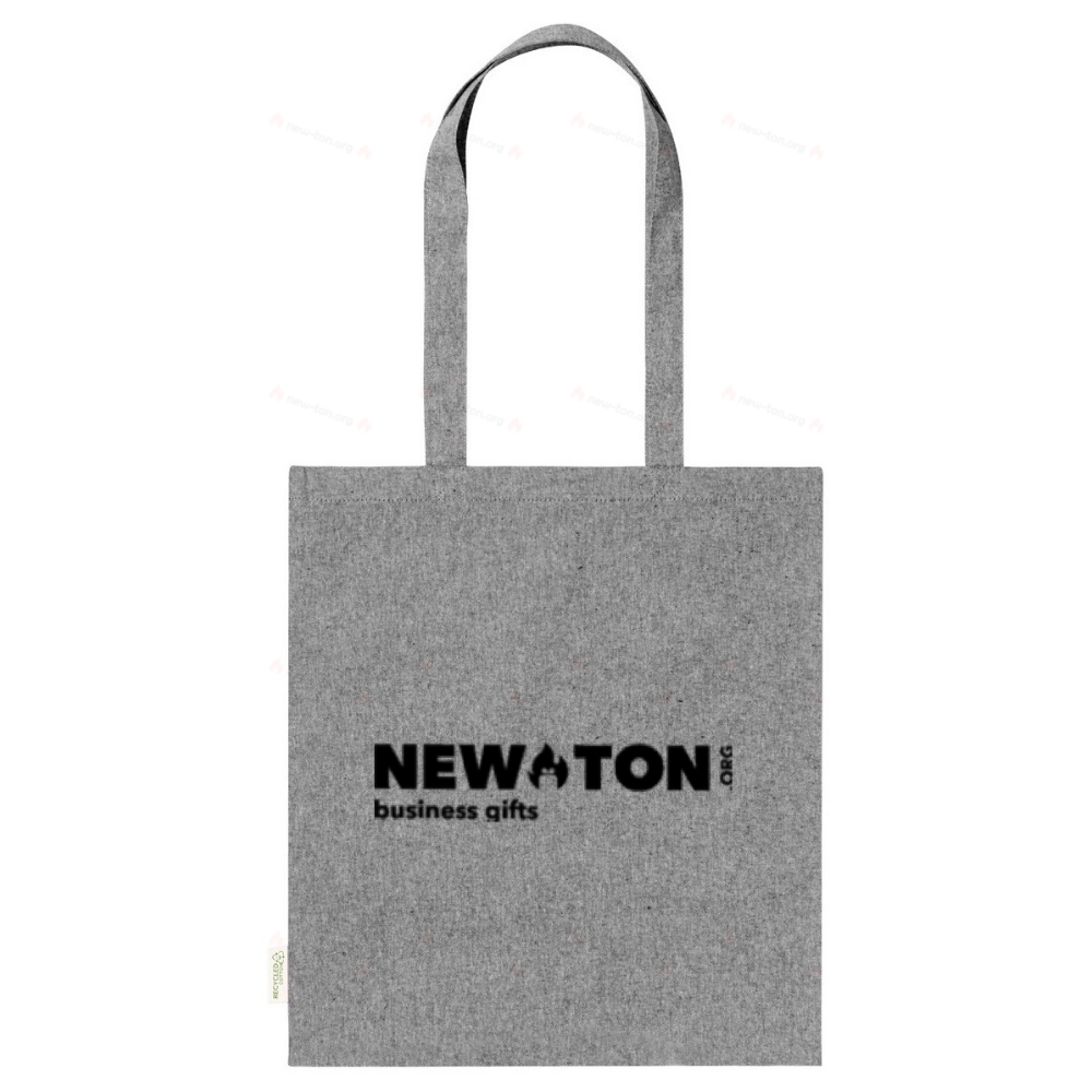 Многоразовая хозяйственная сумка из переработанного хлопка с длинными ручками и отличительной этикеткой из переработанного хлопка. 100% переработанный хлопок, 140 г/м2.