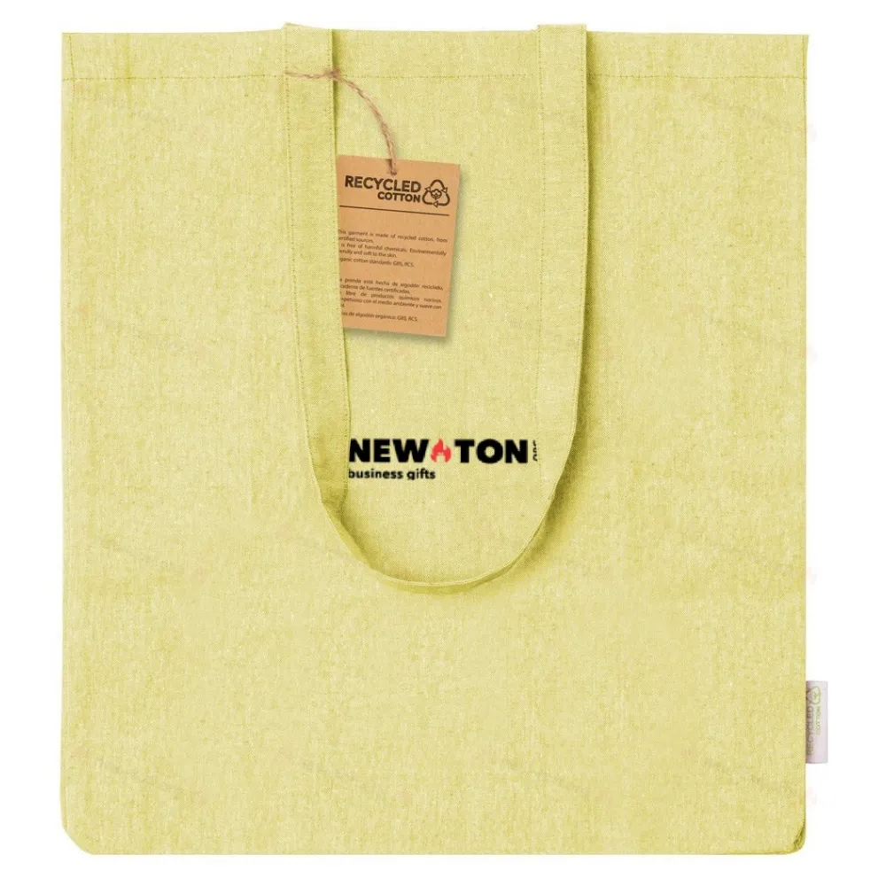 Сумка для покупок из переработанного хлопка с боковым разрезом, длинными ручками и характерной этикеткой из переработанного хлопка. 100% переработанный хлопок, 140 г/м².