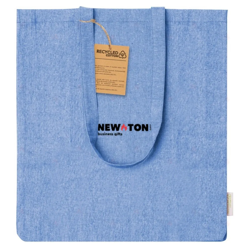 Сумка для покупок из переработанного хлопка с боковым разрезом, длинными ручками и характерной этикеткой из переработанного хлопка. 100% переработанный хлопок, 140 г/м².