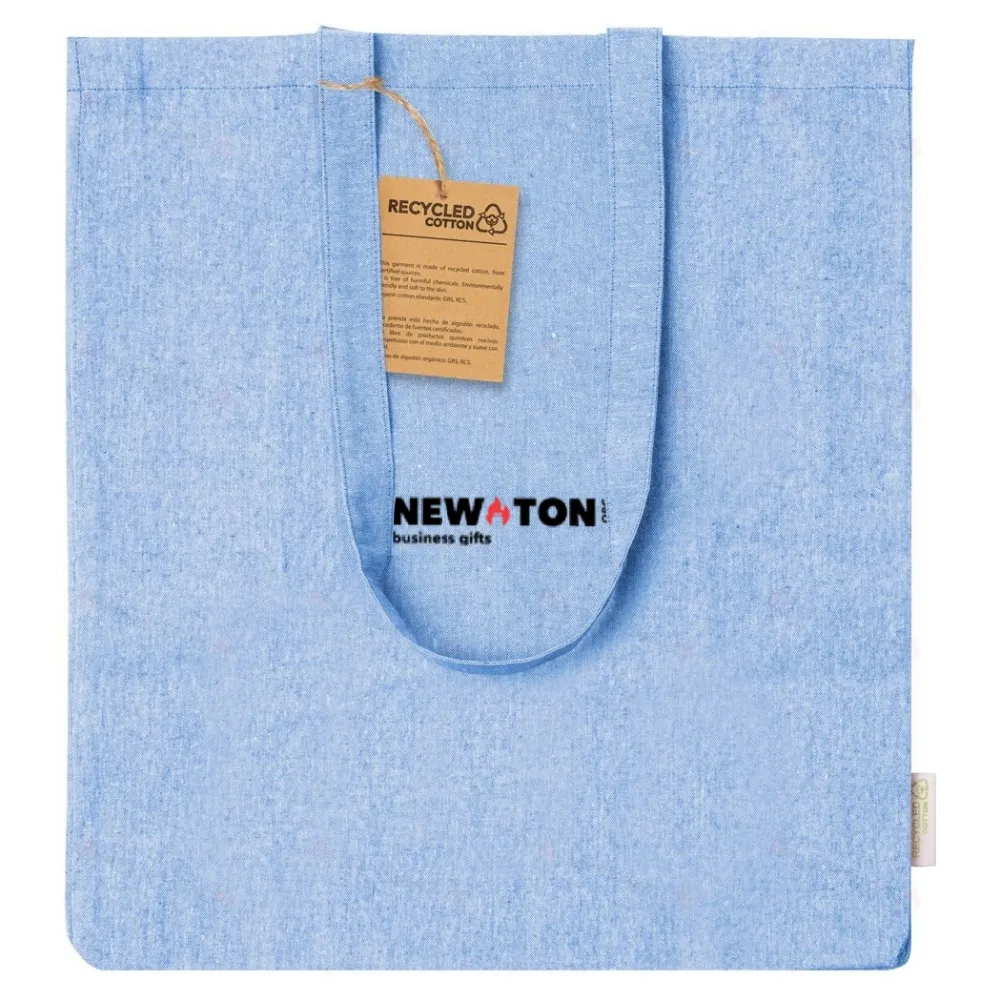 Сумка для покупок из переработанного хлопка с боковым разрезом, длинными ручками и характерной этикеткой из переработанного хлопка. 100% переработанный хлопок, 140 г/м².