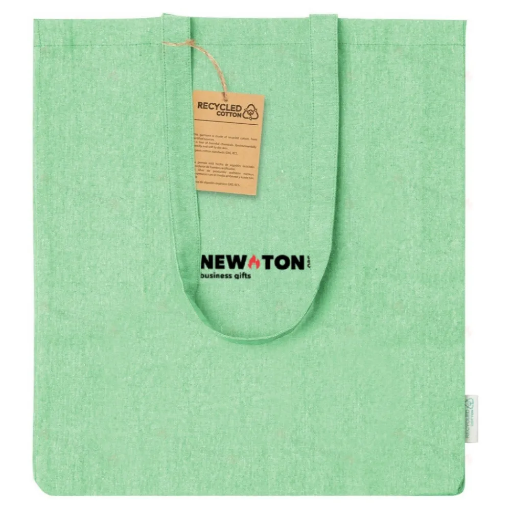 Сумка для покупок из переработанного хлопка с боковым разрезом, длинными ручками и характерной этикеткой из переработанного хлопка. 100% переработанный хлопок, 140 г/м².