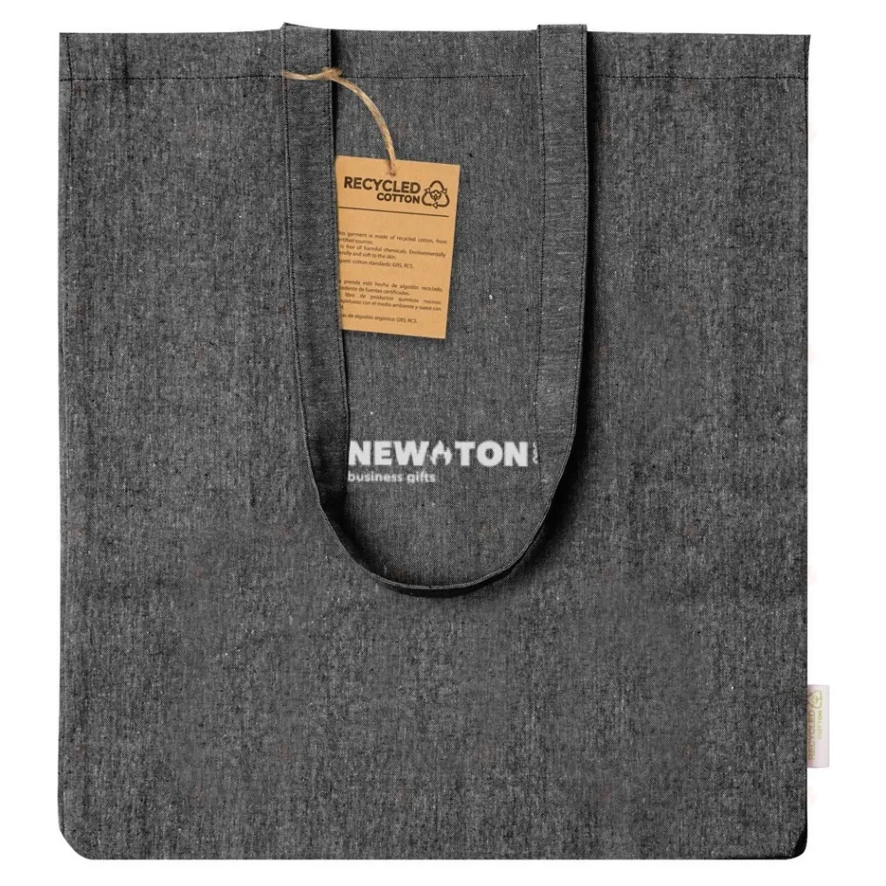 Сумка для покупок из переработанного хлопка с боковым разрезом, длинными ручками и характерной этикеткой из переработанного хлопка. 100% переработанный хлопок, 140 г/м².