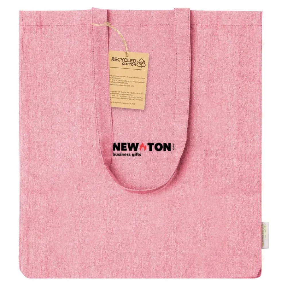 Сумка для покупок из переработанного хлопка с боковым разрезом, длинными ручками и характерной этикеткой из переработанного хлопка. 100% переработанный хлопок, 140 г/м².
