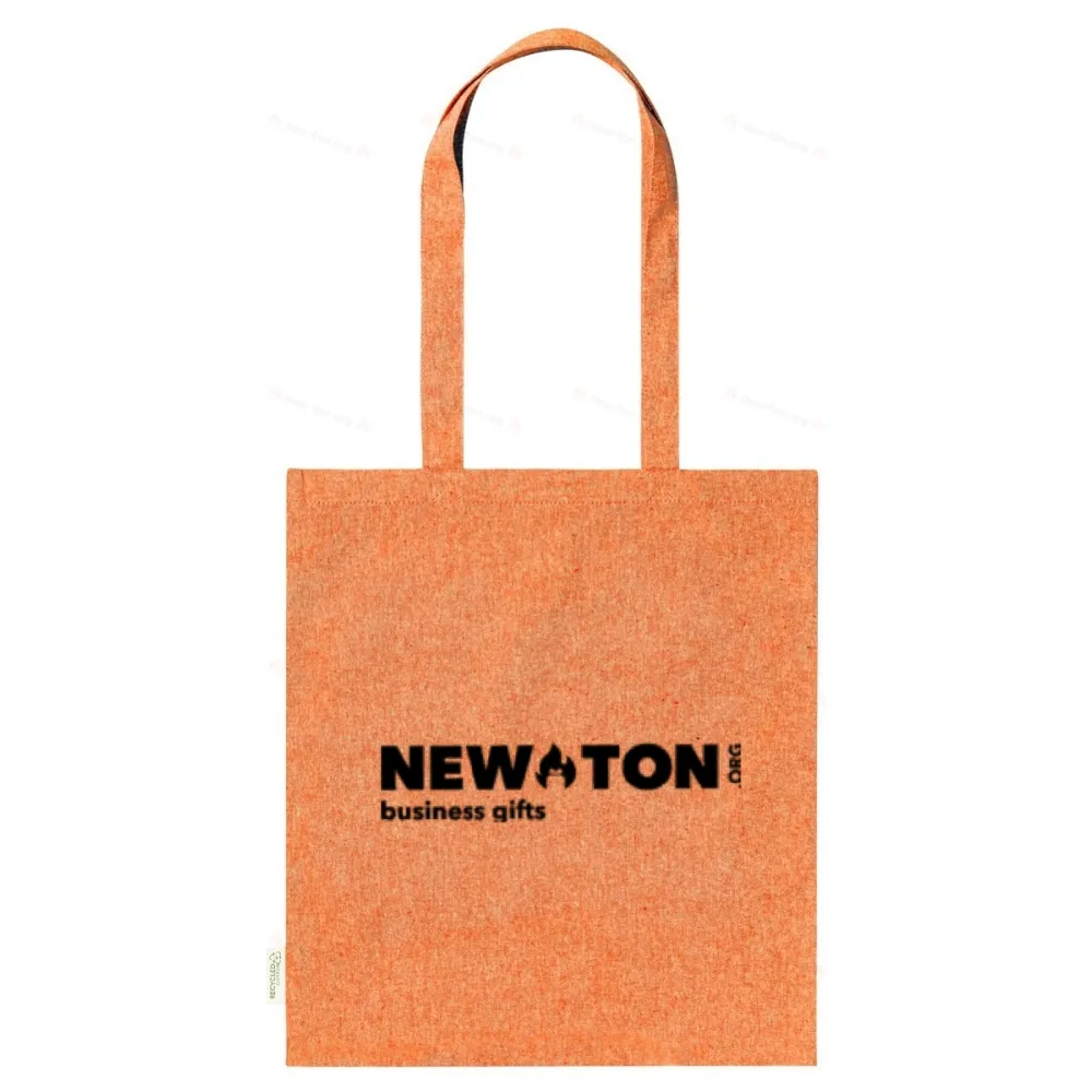 Многоразовая сумка для покупок из переработанного хлопка с длинными ручками и отличительной этикеткой из переработанного хлопка. 100% переработанный хлопок, 140 г/м².