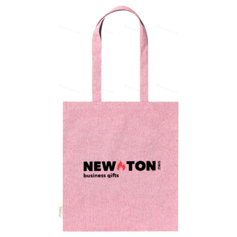 Многоразовая сумка для покупок из переработанного хлопка с длинными ручками и отличительной этикеткой из переработанного хлопка. 100% переработанный хлопок, 140 г/м².