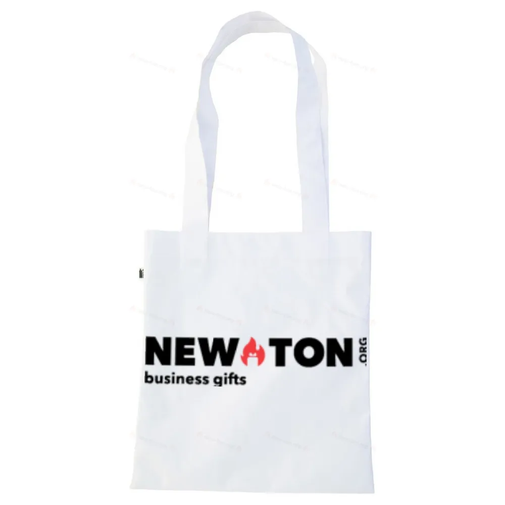 Изготовленная на заказ сумка для покупок из 600D RPET полиэстера с длинными ручками. С полноцветной сублимационной печатью и отличительной этикеткой RPET. Минимальный заказ: 50 шт.