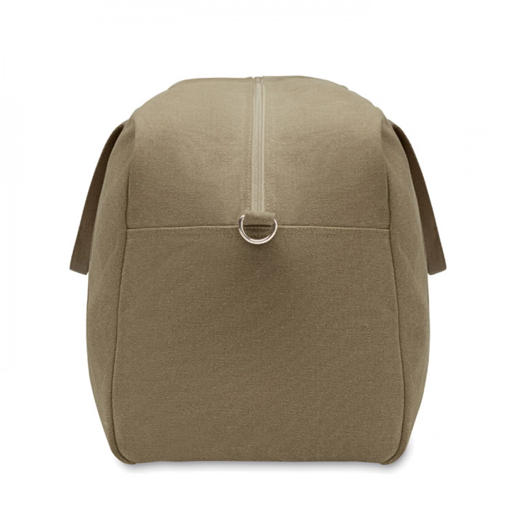 Duffle travel bag in recycled 450 gr/m² fabrics (60% recycled cotton and 40% recycled polyester) with adjustable and detachable cotton strap.