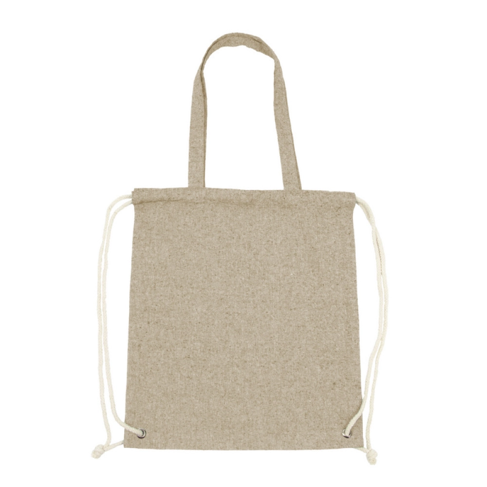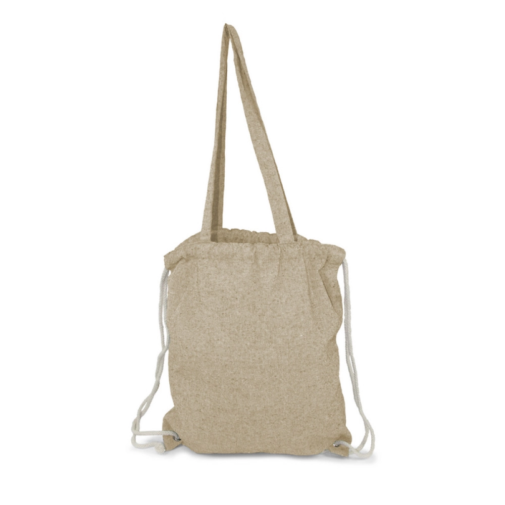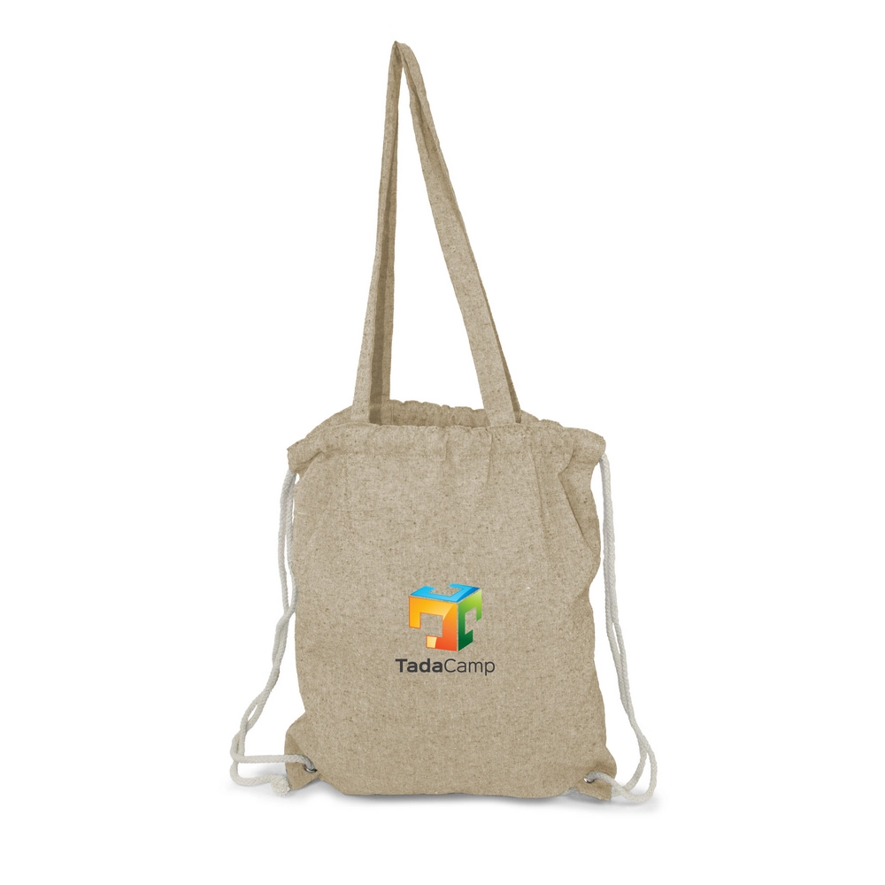 Мешок с завязкой и сумка для покупок 2 в 1, шнур позволяет носить его на спине, а длинные ручки позволяют носить сумку на плече, вмещает небольшие продукты или спортивную одежду для тренировок в зале, изделие из переработанного хлопка 140 г/м2.