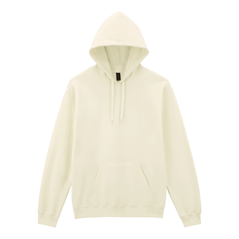 Худи-свитшот с капюшоном из 80% хлопка и 20% полиэстера с карманом спереди. Плотность ткани 285 г/м² (белый цвет 278 г/м²). Продукт бренда Gildan.