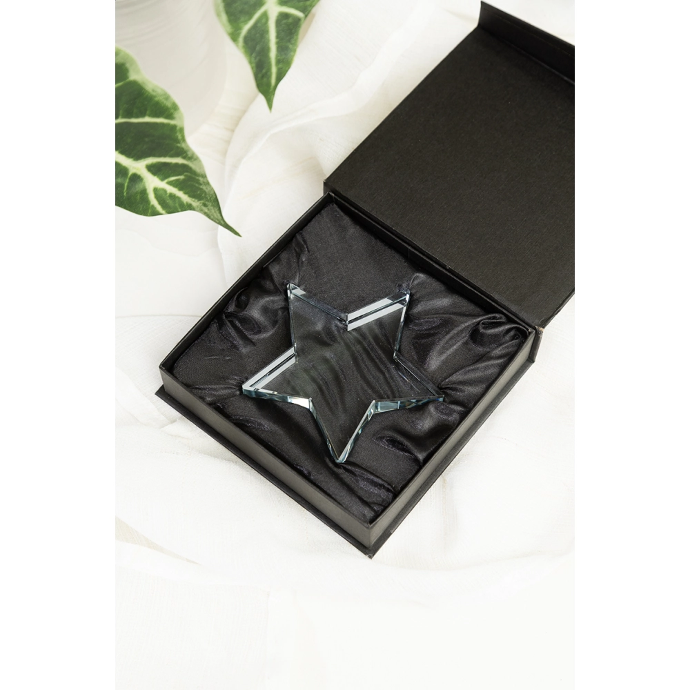 Стеклянный трофей в форме звезды, в черной подарочной коробке.
