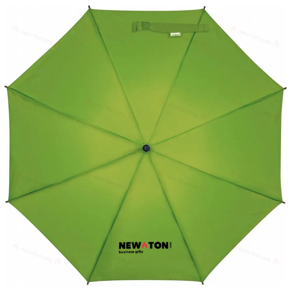 Автоматический, ветроустойчивый зонт с фиберглассовым стержнем, куполом из переработанных ПЭТ-бутылок и изогнутой деревянной ручкой. Ваш логотип будет напечатан на одном сегменте.