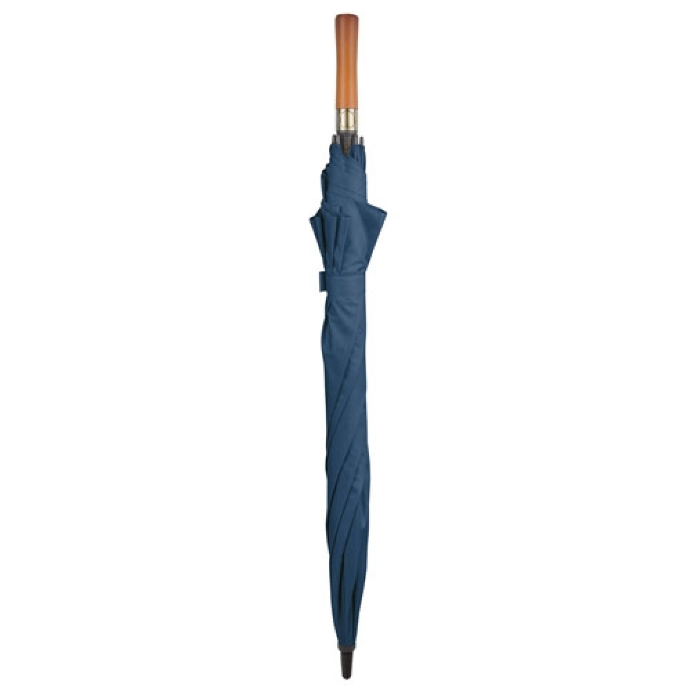 Зонт с кнопкой и деревянной ручкой, из водонепроницаемой ткани. Доступен в темно-синем, черном и бежевом цветах.