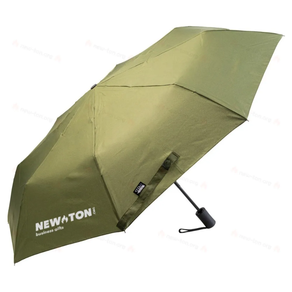 Полностью автоматический (открывание/закрывание), ветрозащитный складной зонт с 8 панелями в сумке подходящего цвета. С металлической рамой, стекловолоконными спицами и резиновой ручкой с ремешком для руки. 190T RPET понж. С характерным ярлыком RPET.