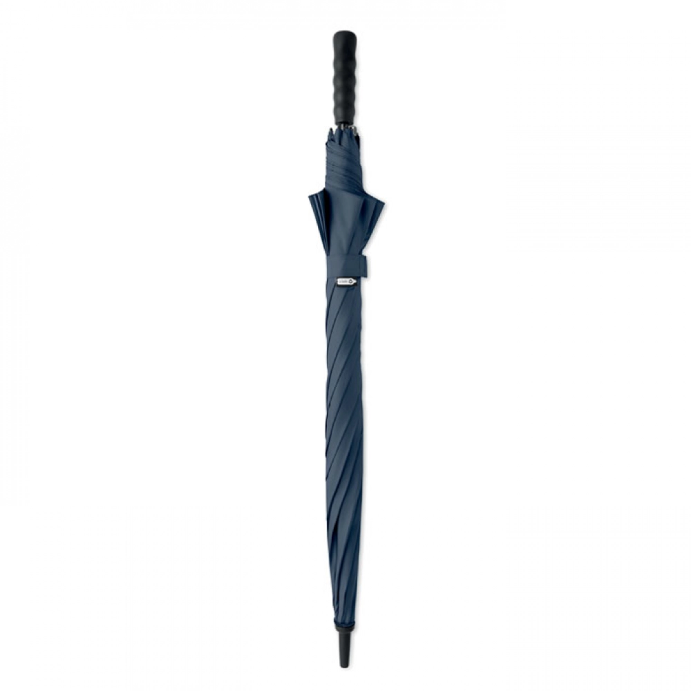 27-дюймовый зонт устойчивый к ветру с автоматическим раскрытием из переработанного эпонжа 190T. Стержень и спицы из стекловолокна. Ручка из переработанной пшеничной соломы и пластика. Пластиковые наконечники и верхняя часть.