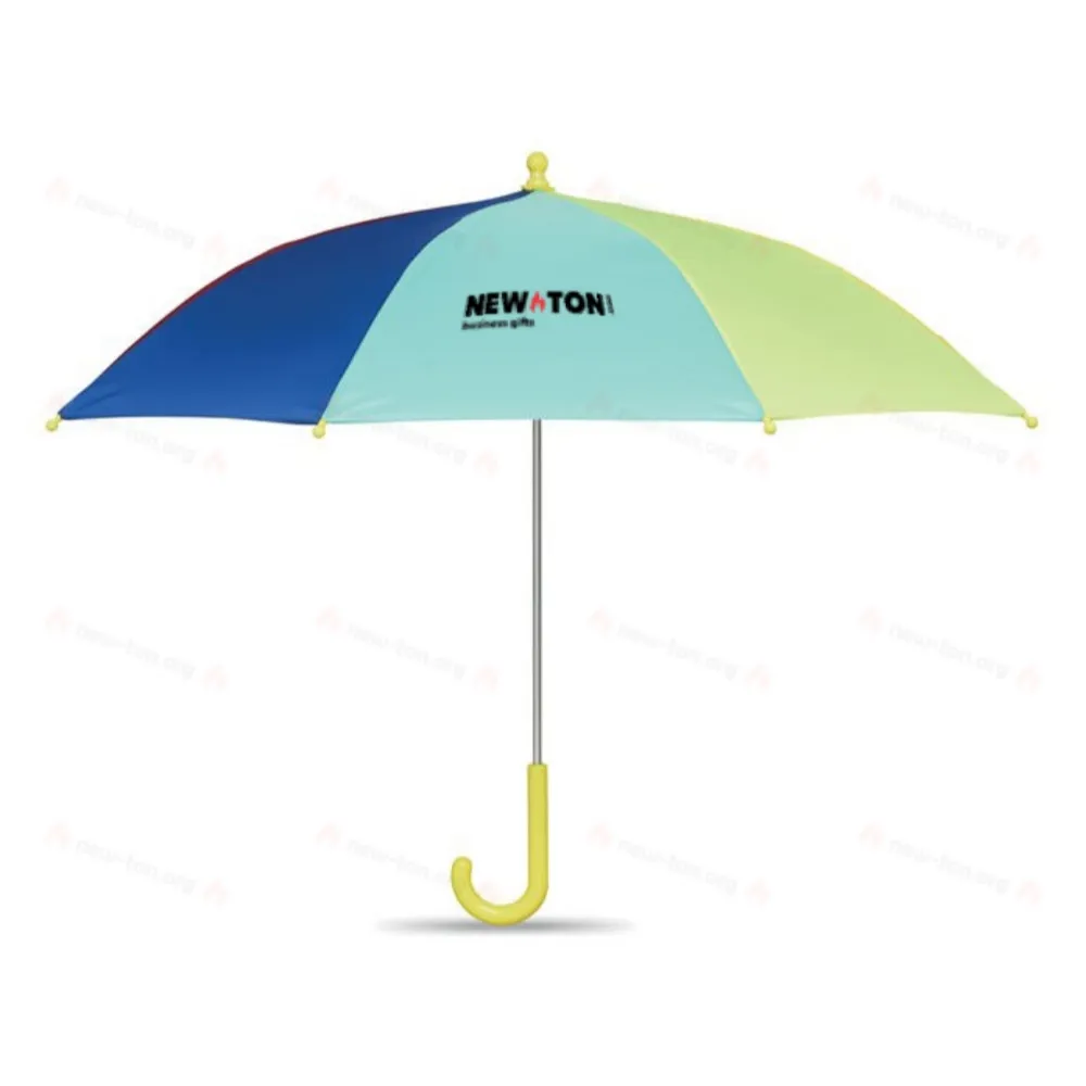 Детский зонт 18 дюймов из эпонжа 190T с радужным рисунком. 8 панелей. Ручное открытие и закрытие. Стекловолоконные стержень и каркас. Пластиковая изогнутая ручка и наконечники.